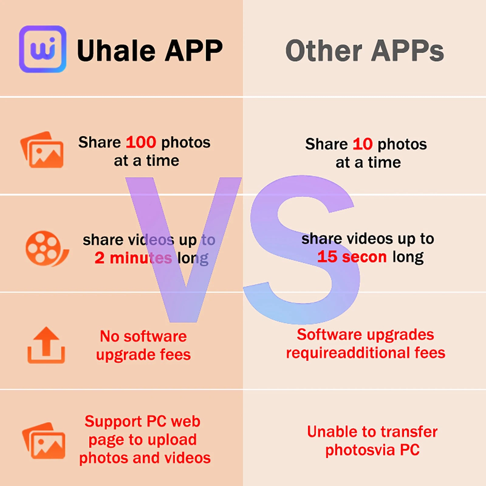 【Instant Wireless Sharing】Connect the electronic frame to home WiFi, and then download the free Uhale App on your phone (download from Android or iOS). You and your family and friends can share photos or videos to the photo frame through free APP, without any subscription fee. Uhale can send 50 pictures and 30 seconds of video in one go!The TF card allows for complete video playback.