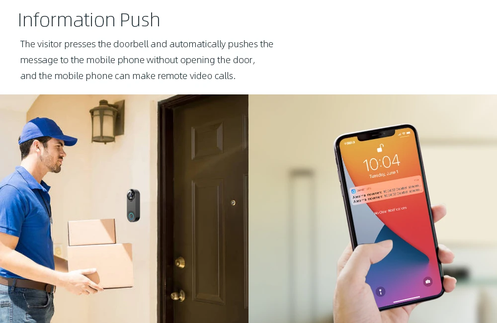 - Alarm notification. When someone press the doorbell, you will receive a notification that APP pushed