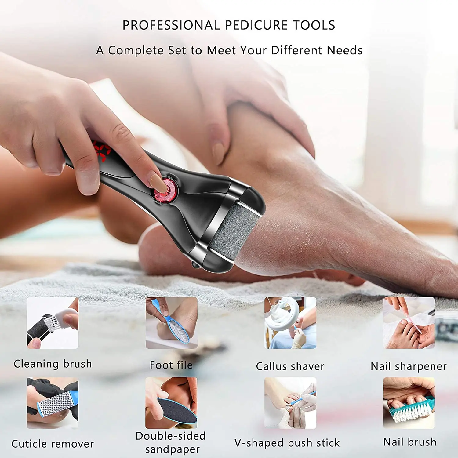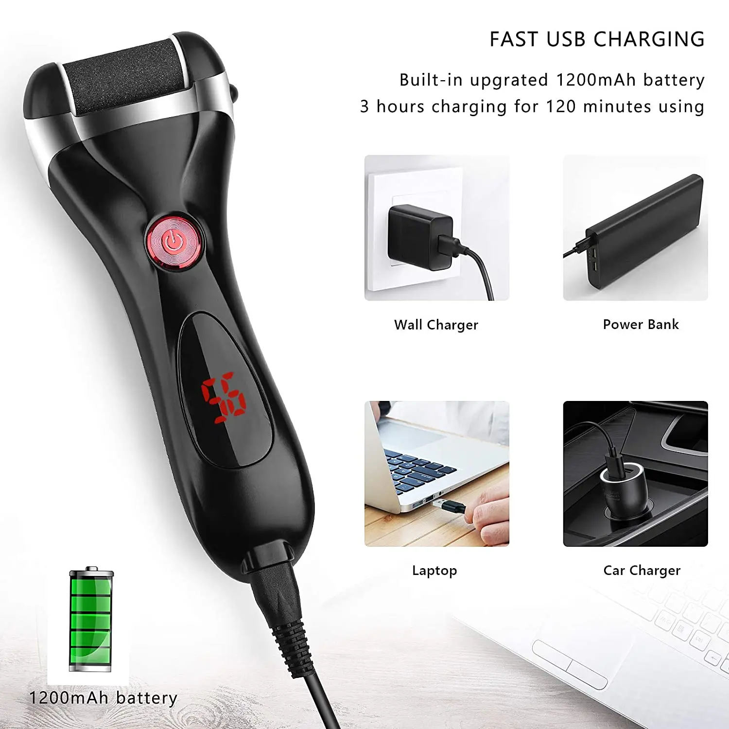 Rechargeable Electric Foot Callus Remover - Efficient foot pedicure tool, simply recharge the battery of the perfect cordless electric foot file with the provided charging adapter for 3 hours. 1200 mAh Li-ion battery that can be used for up to 90 minutes.