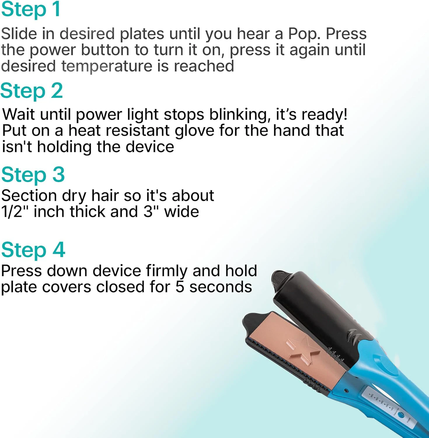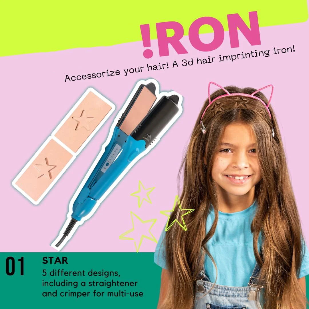 Continuously until the hair becomes wet What it includes: the first 3D hair embossing iron, 5 different boards, including 3 shaped boards (stars, lightning, heart).