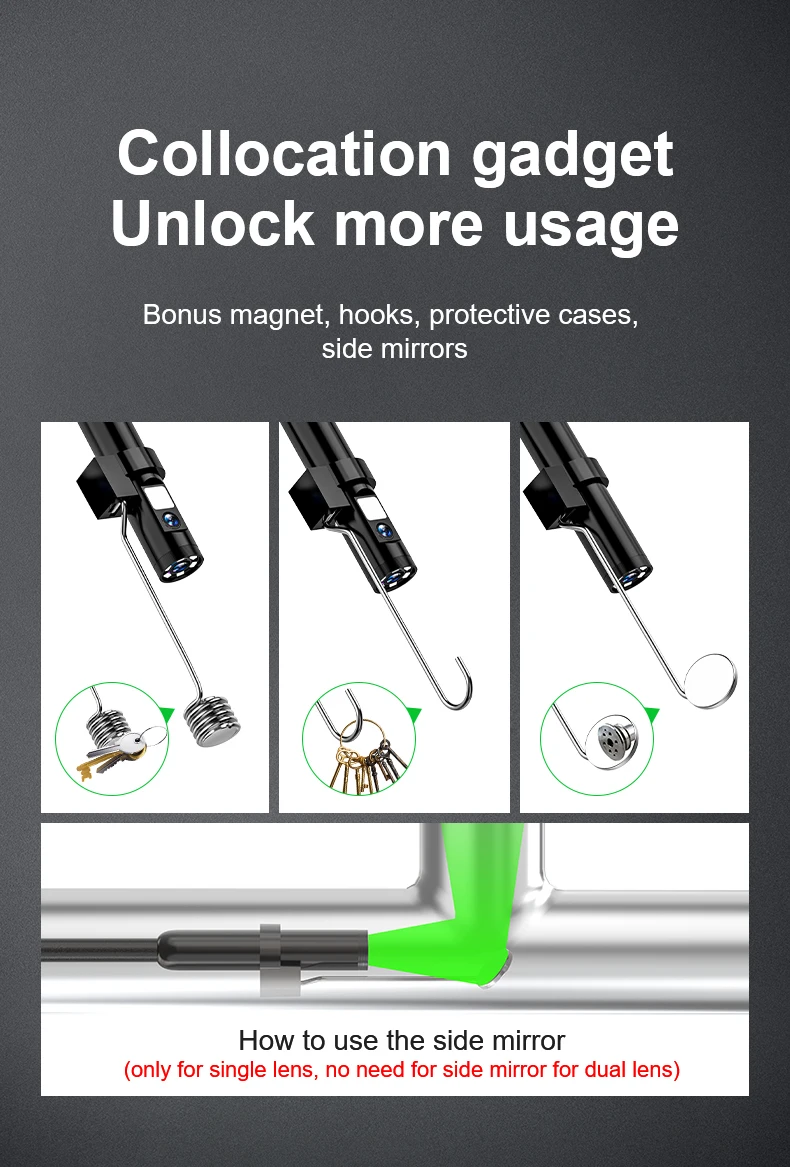 Small Accessories, Big Role : Hooks ,Magnets ,Mirror ,3 useful accessories can be attached on the camera probe for different us !