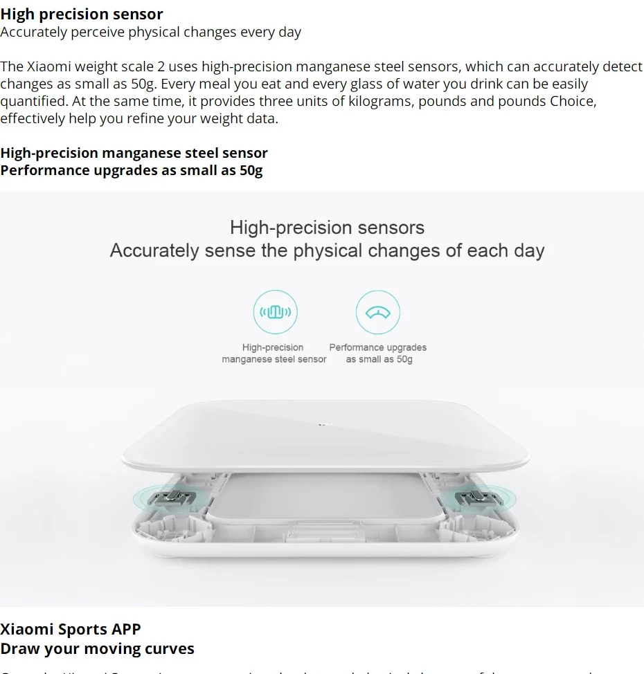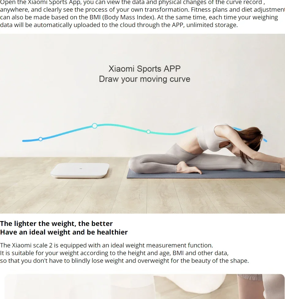 2.Xiaomi Sports APP:Open the Xiaomi Sports App and view the curve of data and body changes anytime, anywhere.Fitness plans and diet adjustments can also be made based on the BMI. At the same time,each weighing record will be uploaded to the APP cloud for unlimited storage.