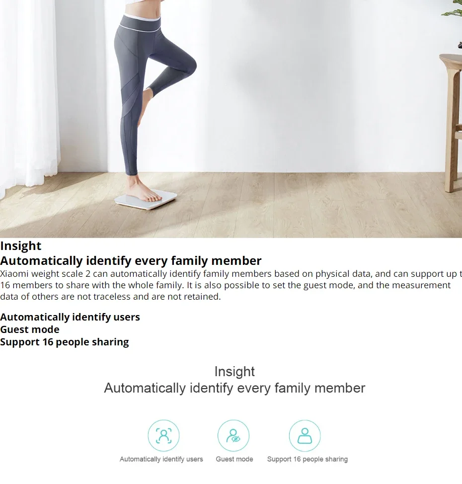 6.Intelligent Analysis:Home members can be automatically identified based on physical data, and up to 16 members can be shared for family sharing.Visitor mode can also be set, and other people's measurement data is not saved.