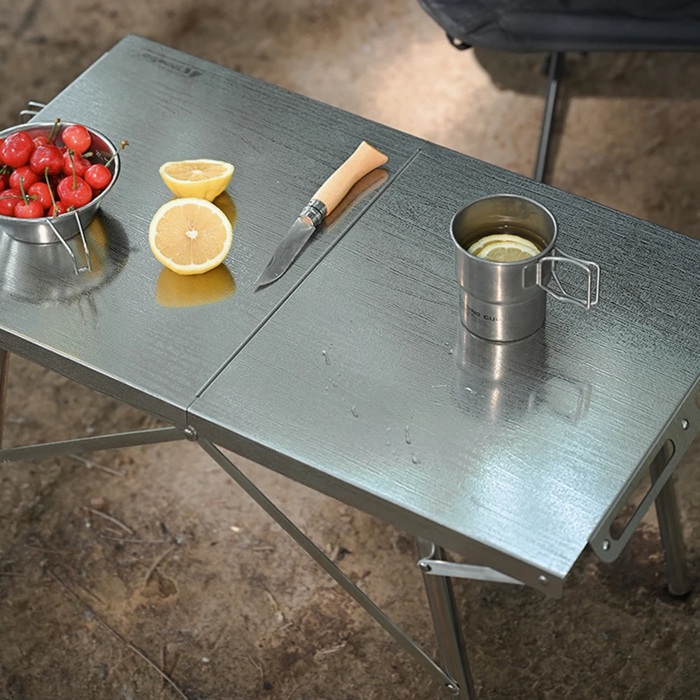 Feature: 1. High-Temperature Resistance: Made from durable 201 stainless steel, this camping folding table can withstand high temperatures. It serves as a cooking station, allowing you to place stoves or cookware directly on the table surface. 2. 8K Mirror Pressed Wood Grain Surface: The tabletop features an 8K mirror pressed wood grain surface, providing scratch resistance, fingerprint resistance, and excellent adhesion. It remains free from scorch marks, offering a realistic and pleasant tactile experience. 3. Double Triangle Structure: The outdoor table's design incorporates a double triangle mechanical structure, ensuring a stronger load-bearing capacity. The stainless steel top and legs provide high strength and resilience, supporting a static weight of up to 50kg while maintaining stability. 4. Side Hanging Storage: Utilize the side hanging storage to hang utensils, lamps, and other items without occupying valuable tabletop space. Expand the available space for a more organized and convenient camping experience. 5. Portable Storage Bag: This folding table comes with a portable storage bag, making it easy to carry and store. Simply grab the bag and go, ensuring hassle-free transportation and compact storage. Specification: Origin: Mainland China Type: Folding Portable Table Material: stainless steel Color: silver Weight: 3.03kg Unfolded size: 630mm/24.80in * 350mm/13.78in * 405mm/15.94in Storage size: 446mm/17.56in * 350mm/13.78in * 48mm/1.89in