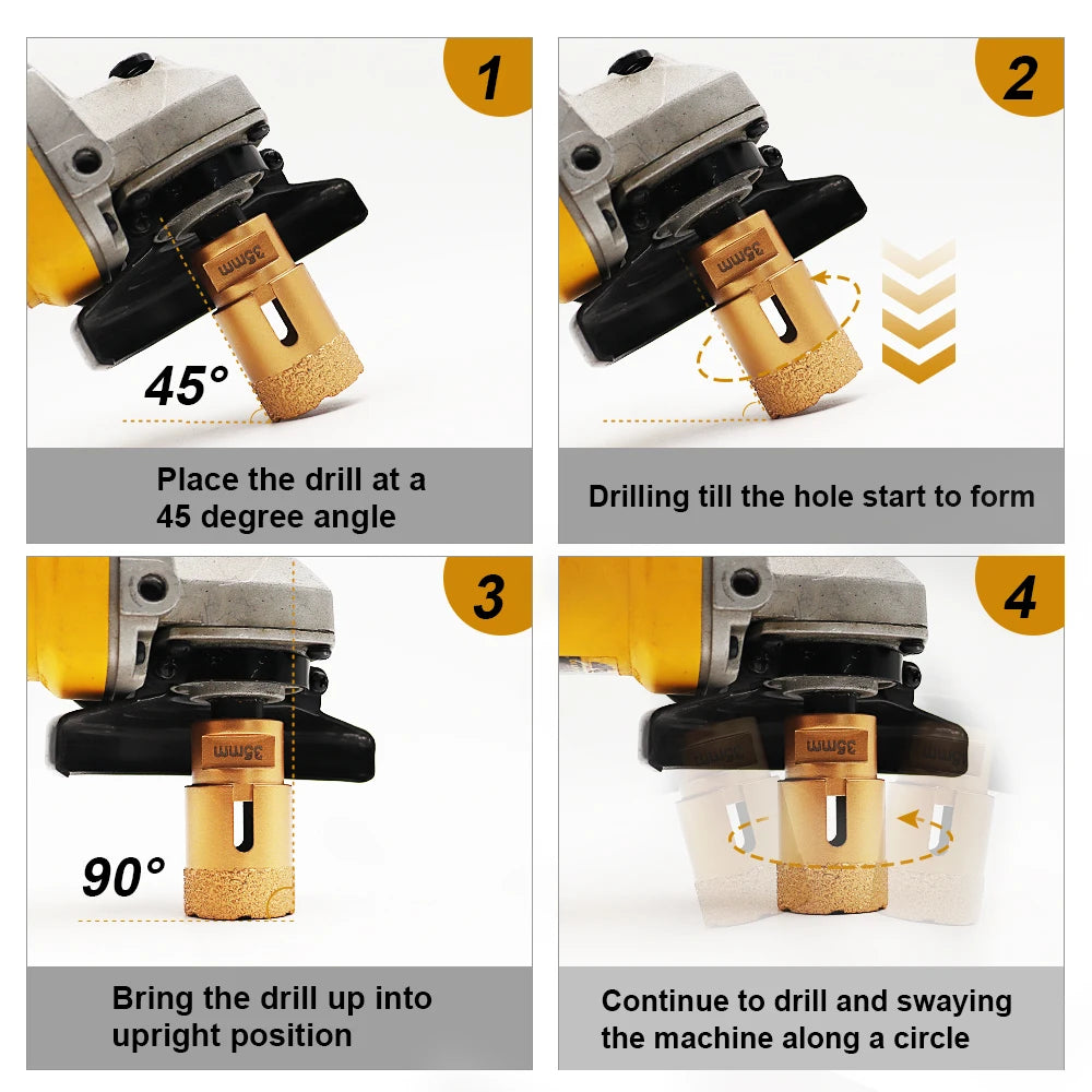 Place the drill at a 45 degree angle. Drilling till the hole start to form. Bring the drill up into upright position.