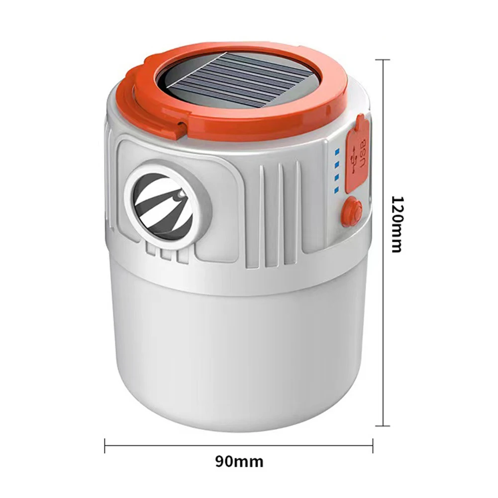 Feature: 1. High beam + low beam dual light source: suitable for the needs of different scenarios; 2. Solar + USB charging: two charging methods; 3. With hook: it can be used as a tent lamp for outdoor camping; 4. It can be used as emergency power supply for mobile phones; 5. Power display: always know the battery power; 6. Two control methods: switch control + remote control control. Specification: Main material: ABS+PC Product color: white + orange Product size: about 120x90x90mm/4.72x3.54x3.54in Product net weight: about 200g Light brightness: 300LM Lighting gear: 6 gears, strong light-medium light-weak light-flicker-SOS-flood light Charging method: solar + USB charging Battery capacity: 800mAh Note: Due to the different monitor and light effect, the actual color of the item might be slightly different from the color showed on the pictures. Thank you! Please allow 1-2cm measuring deviation due to manual measurement. ![]() 1x Camping Light