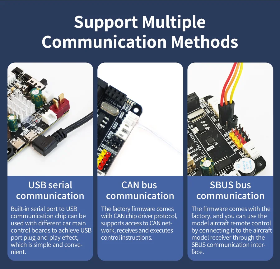 4.Support CAN bus communication, USB serial communication, SBUS bus communication.