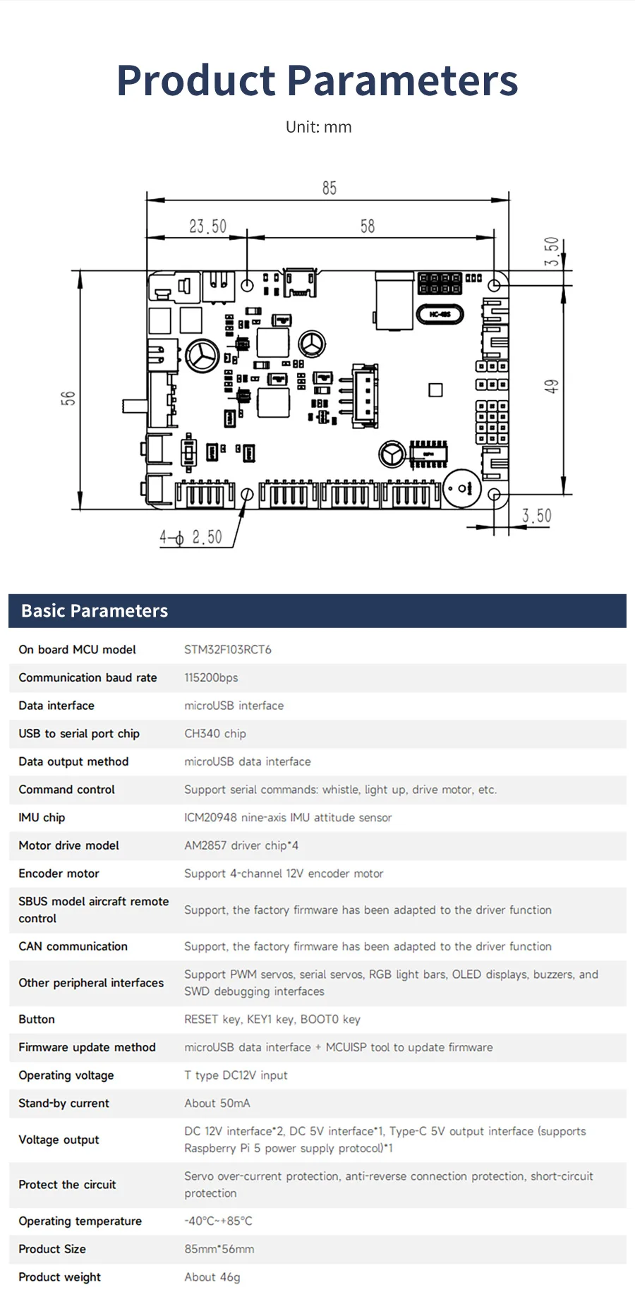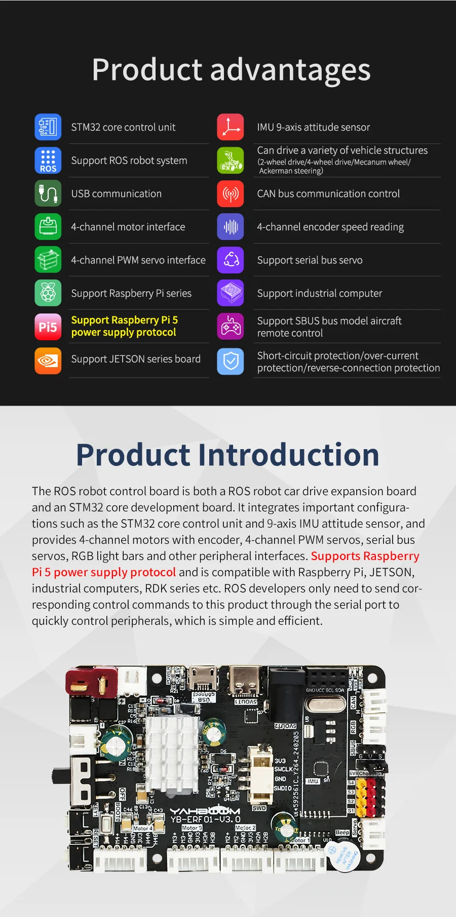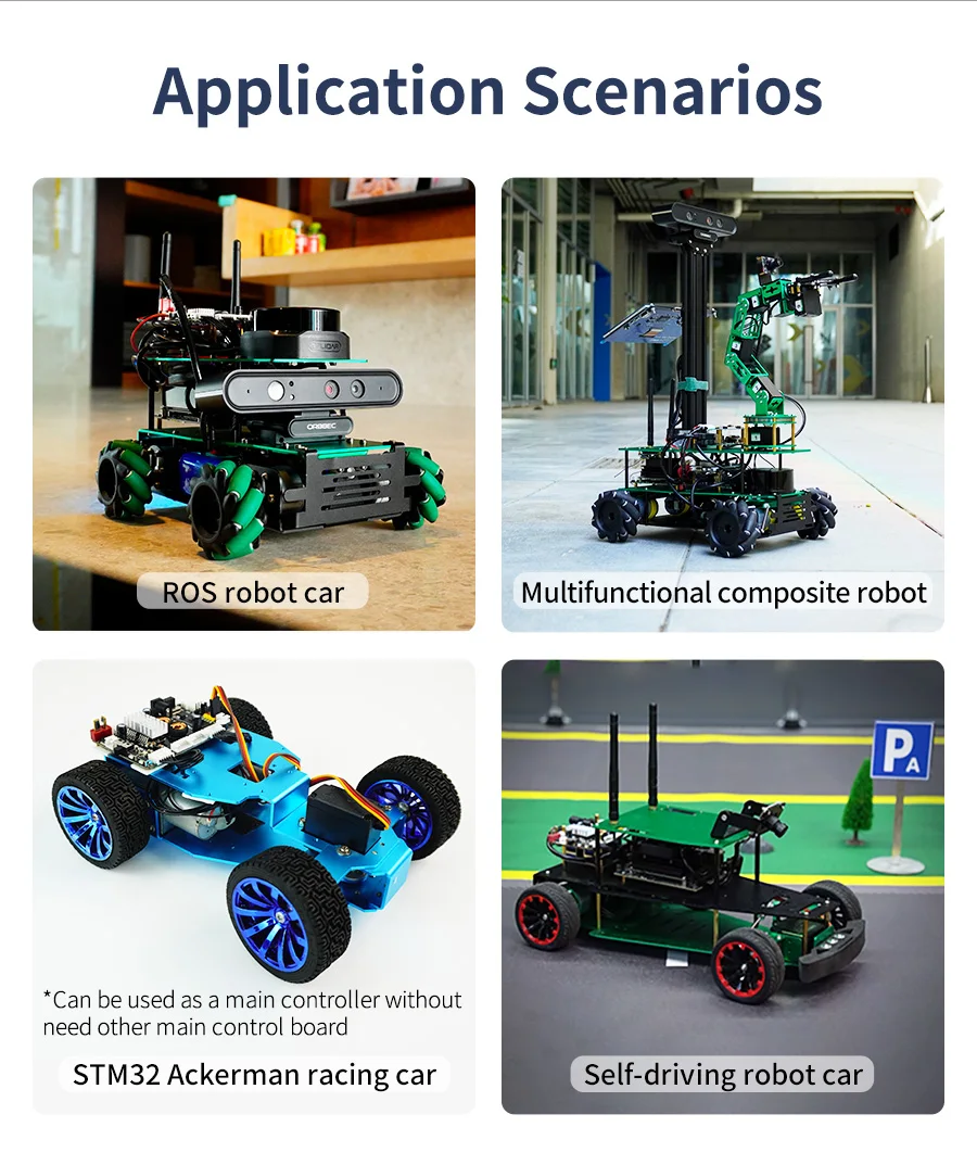 This robot control board is not only a ROS car driver board, but also a STM32 core development board. It integrates STM32 core control unit, 9-axis attitude sensor and other components, and provides four-way encoder motor, four-way PWM servo, serial bus servo, RGB light bar and other peripheral interfaces. It can communicate and supply power with main control boards such as Raspberry Pi, JETSON series, RDK X3 boards, and industrial computers. If you want to build a ROS robot or a smart car, it will be a good choice.