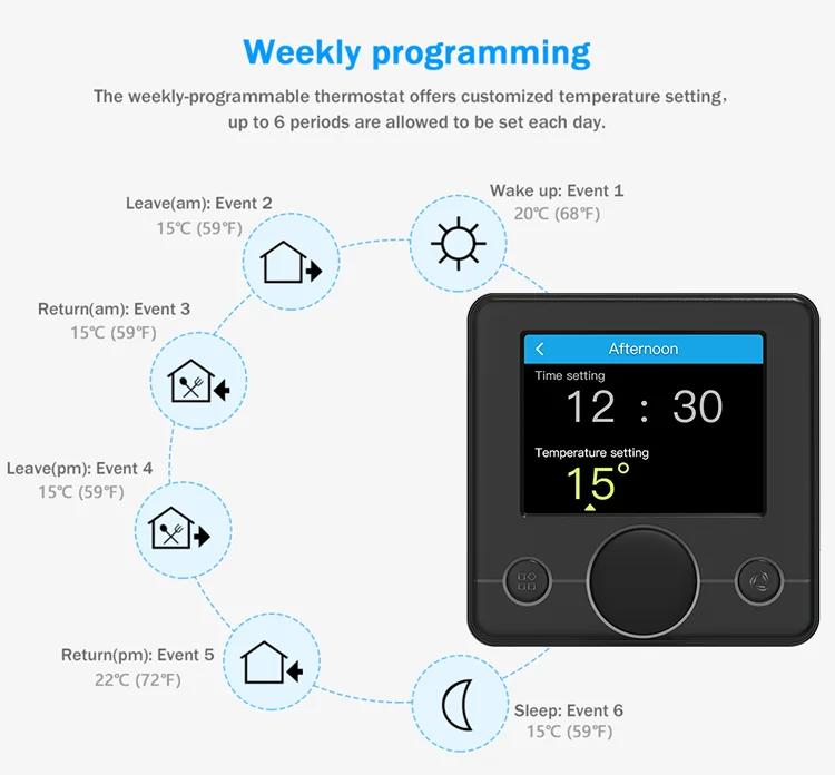 The thermostat supports different temperature setting accordingly with 6 time-modes daily.7 Days programmable