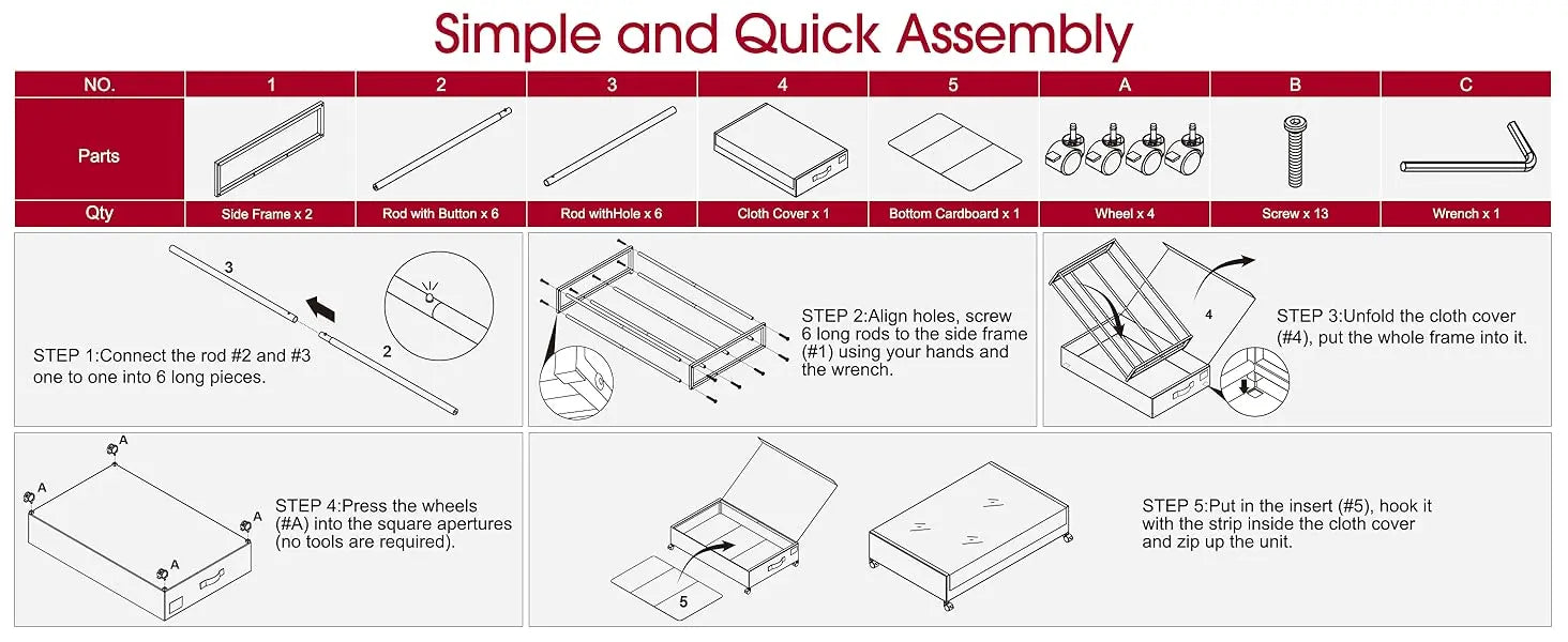 TOOL-FREE & QUICK ASSEMBLY-Assemble the anti-rust metal frame first, then fix the cloth cover on the frame.The under bed shoe storage is collapsible with a soft cover and removable bottom board, fold it to save space when not in use.
