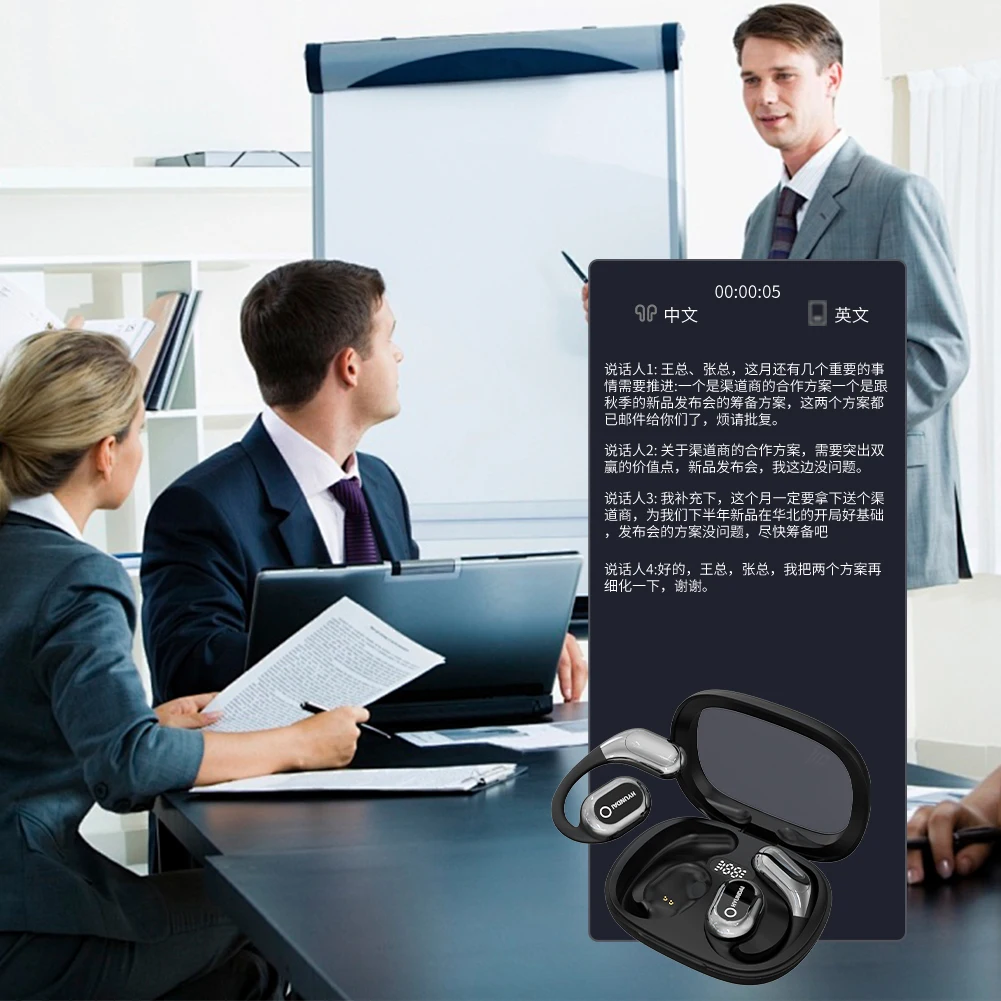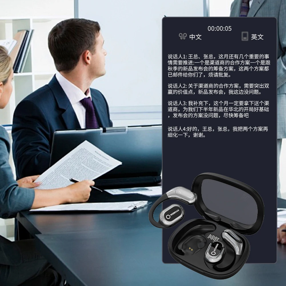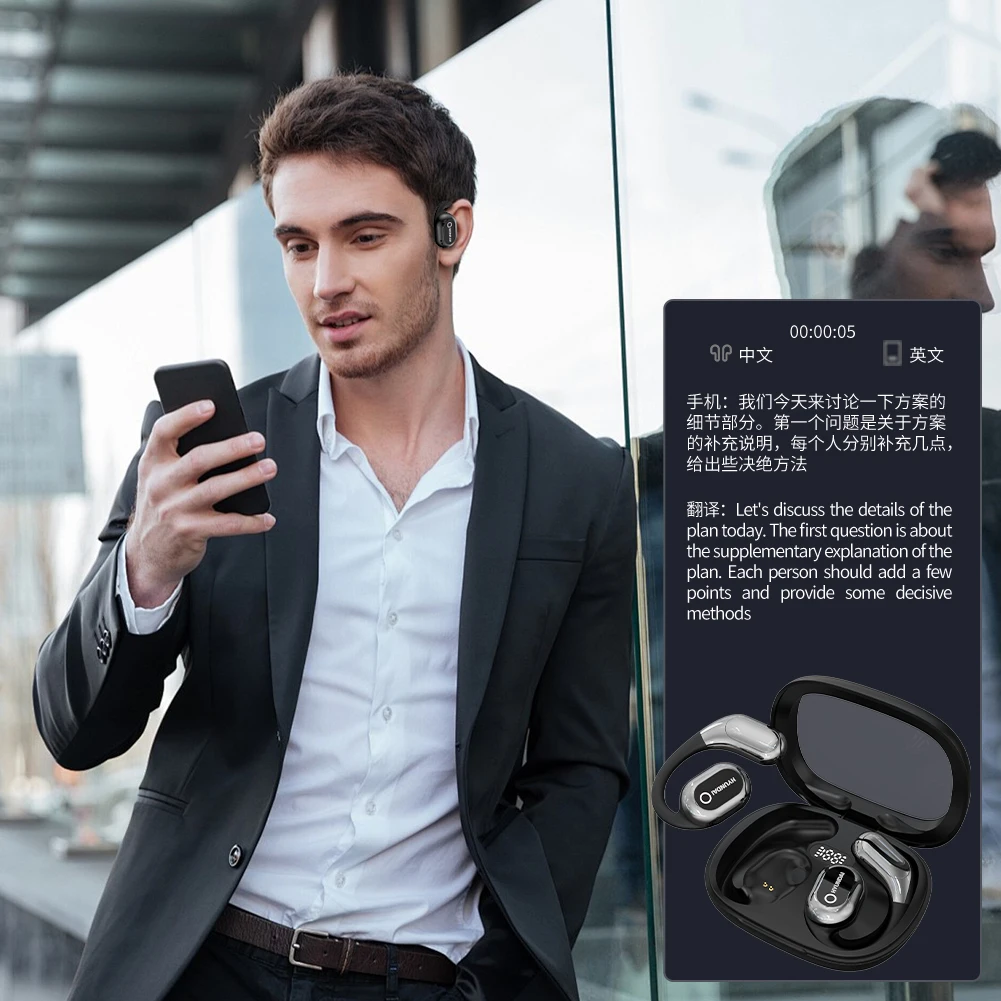Feature: 2. Continuous Learning and Updates: The translator earbuds constantly learn and improve over time. Regular updates ensure your translations stay in sync with the latest linguistic nuances and vocabulary, providing reliable and current communication. 3. Advanced Bluetooth-Compatible 5. 4 Connectivity: Experience fast and stable connections with the real-time two-way earbuds, featuring low-power Bluetooth-Compatible 5.4. Easily pair with your smartphone for instant voice translation and access to various language packages. 4. Immersive HD Sound Quality: The translator device uses cutting-edge directional audio technology to deliver crystal-clear sound. Enjoy optimized audio settings for an immersive listening experience, whether on calls or during translations. 5. Compact and Comfortable Design: These translation earphones are lightweight and ergonomically designed for all-day comfort. Small enough to fit in your pocket, they are the ideal companion for international business, learning, and adventure.